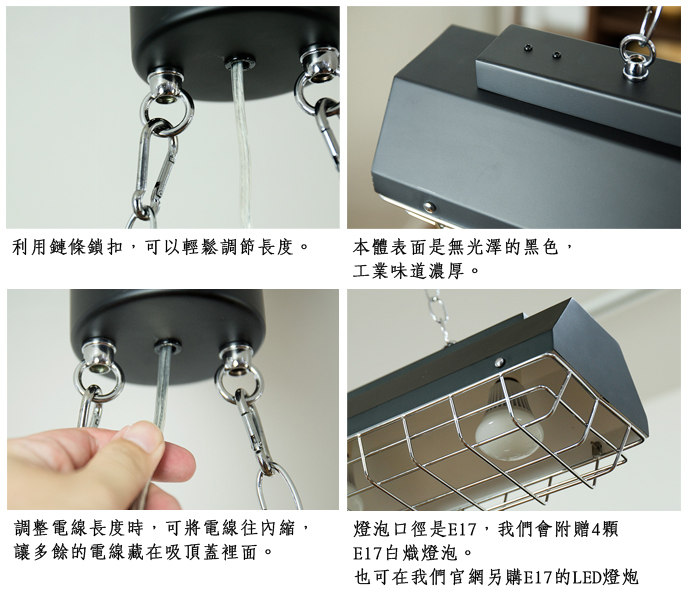| 備註 | 功率/ 160 W(40 W×4) 可裝LED燈泡,口徑E17,一顆燈泡最高使用40瓦。 (附贈四顆E17白熾燈泡) |